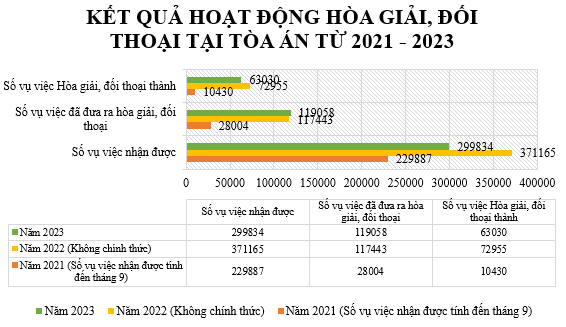 Riêng trong năm 2023, các Tòa án đã nhận được 299.834 đơn (295.218 đơn dân sự; 4.616 đơn hành chính) khởi kiện đủ điều kiện tiến hành hòa giải, đối thoại theo quy định của Luật Hòa giải, đối thoại tại Tòa án. Trong số 129.856 đơn đương sự đồng ý hòa giải (Vụ án cũ còn lại: 9.603 đơn, vụ án mới thụ lý: 120.253 đơn), đã giải quyết 119.058 vụ việc, đạt tỷ lệ 91,68% (hòa giải, đối thoại thành 63.030 vụ việc; hòa giải, đối thoại không thành 22.054 vụ việc; không tiến hành hòa giải, đối thoại được 19.557 vụ việc) .