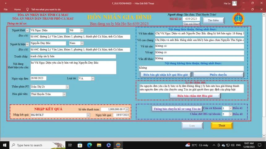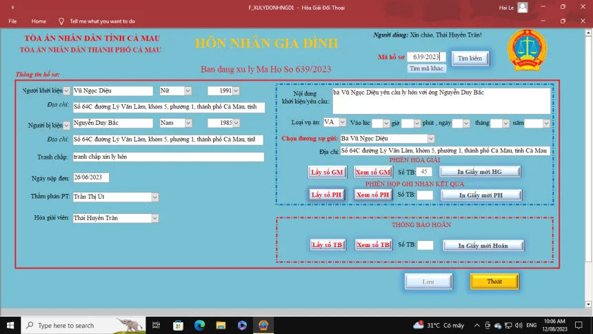 Với phần mềm này, các cán bộ Tòa án có thể thực hiện các thao tác nhanh chóng, như cập nhật thông tin vụ việc, quản lý hồ sơ, và thống kê kết quả một cách chính xác. Mỗi vụ việc được gắn mã hồ sơ riêng, tích hợp thông tin về năm, loại án và đơn vị xử lý, giúp việc tra cứu trở nên thuận tiện hơn.