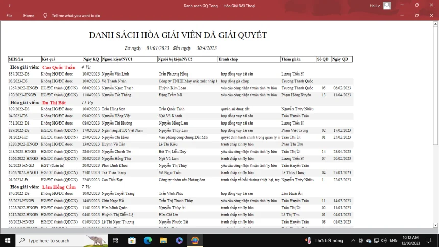 Cửa sổ danh sách giải quyết án của Hòa giải viên